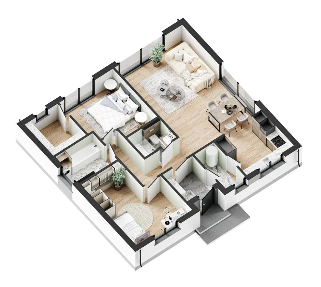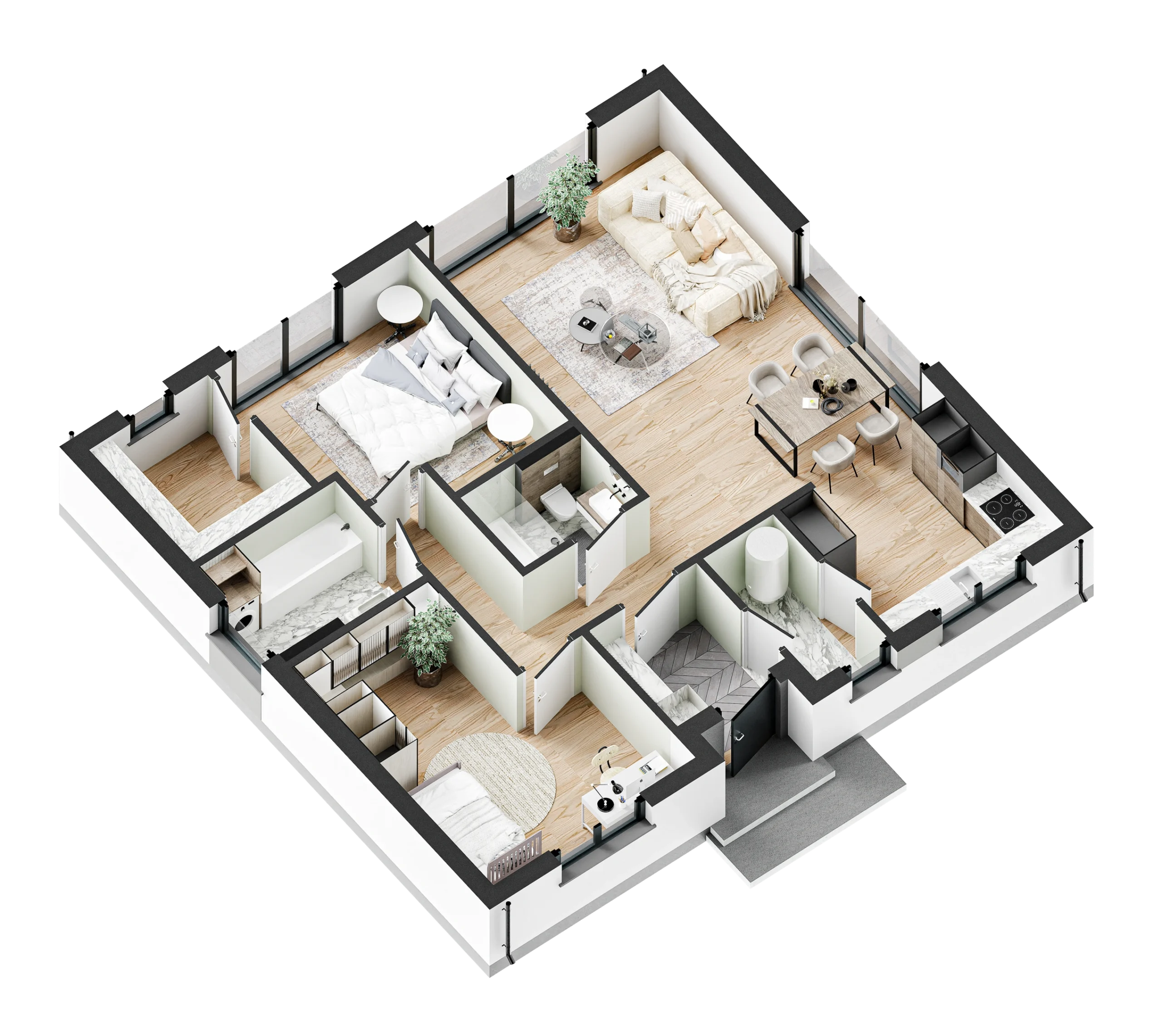 - okna 3-szybowe, 7-komorowe, kolor zewnętrzny do wyboru, System profili: Aluplast